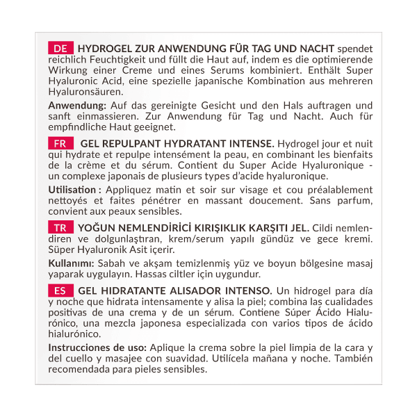 This intensely hydrating formulation has an emugel consistency that contains multiple Hyaluronic Acid types including Super Hyaluronic AcidTM. Intensely moisturises and plumps the skin , creating the effect of a smooth, healthy, glowing complexion.